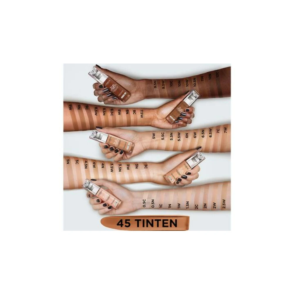 L’Oréal Paris True Match FoundationL’Oréal Paris True Match Foundation is een foundation met een medium dekking en een stralende finish die jou een natuurlijk make-up resultaat geeft. De vernieuwde formule bevat tot 6 verschillende pigmenten wat zorgt voor een uiterst precieze match met de huidskleur.Kies de juiste True Match FoundationStap 1: Bepaal jouw ondertoon, is deze warm, koel of neutraal? De letter in de foundationnaam staat voor een Warme (D/W), Koele (R/C), o